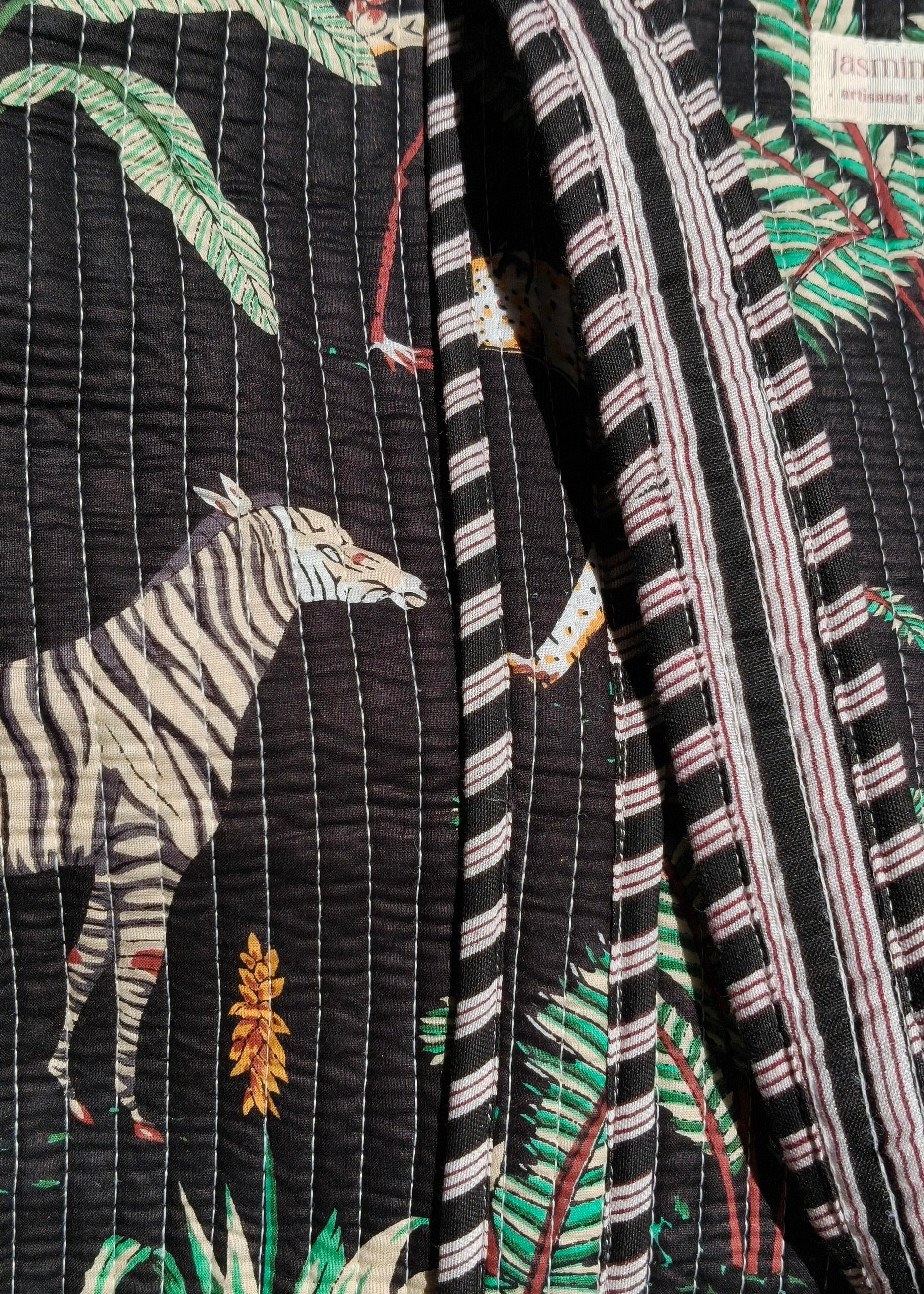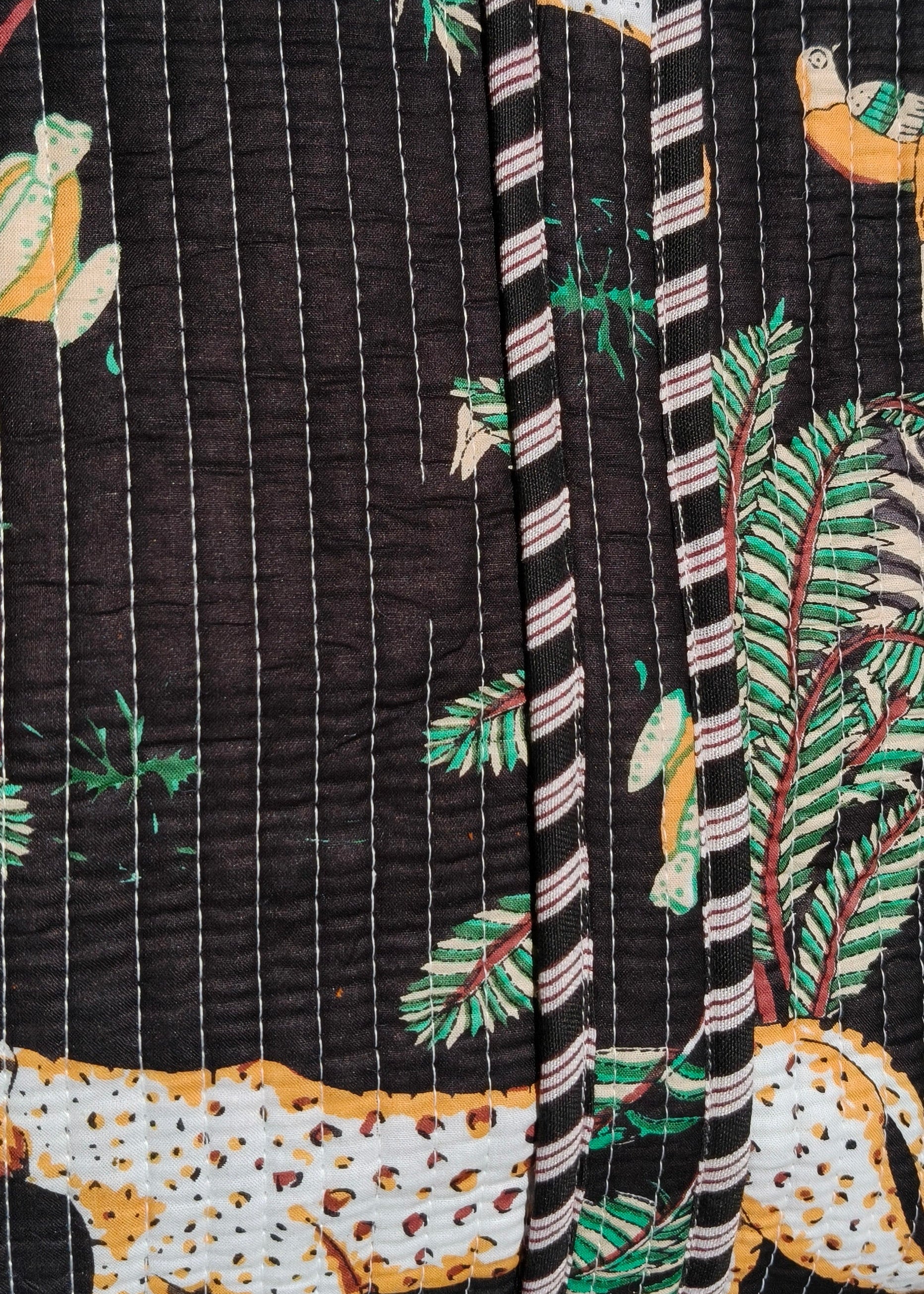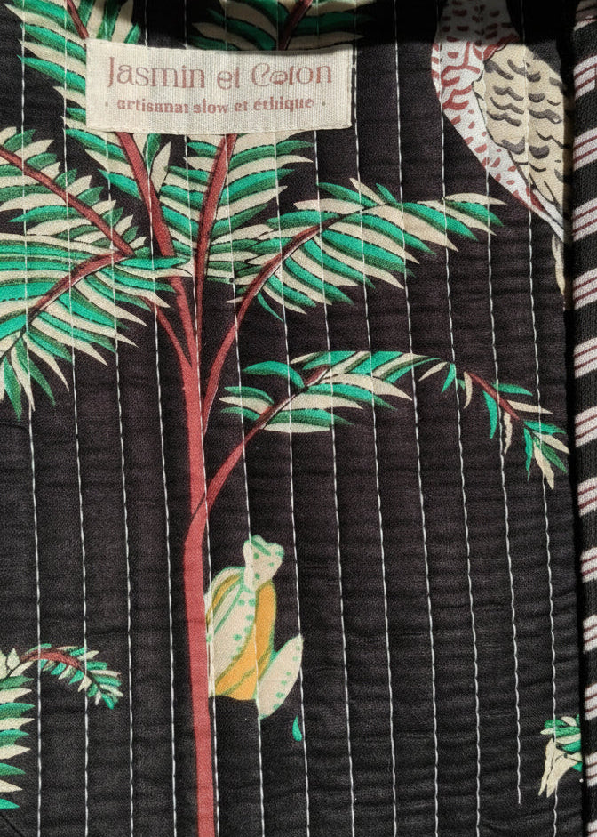 The Black Jungle Bag is meticulously handmade and hand block-printed by Indian artisans, making each piece unique. This lightweight, 100% cotton bag is reversible for instant style changes and is perfectly sized for shopping, travel, or use as a mommy bag.